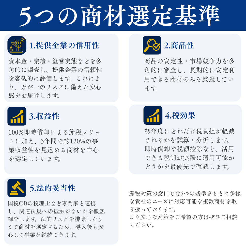 日本国内に100種類以上ある節税対策商品の中から、重要な5つの基準で徹底調査し、さらにその中でも特に優れた約10種類の商品を厳選してご提案します。